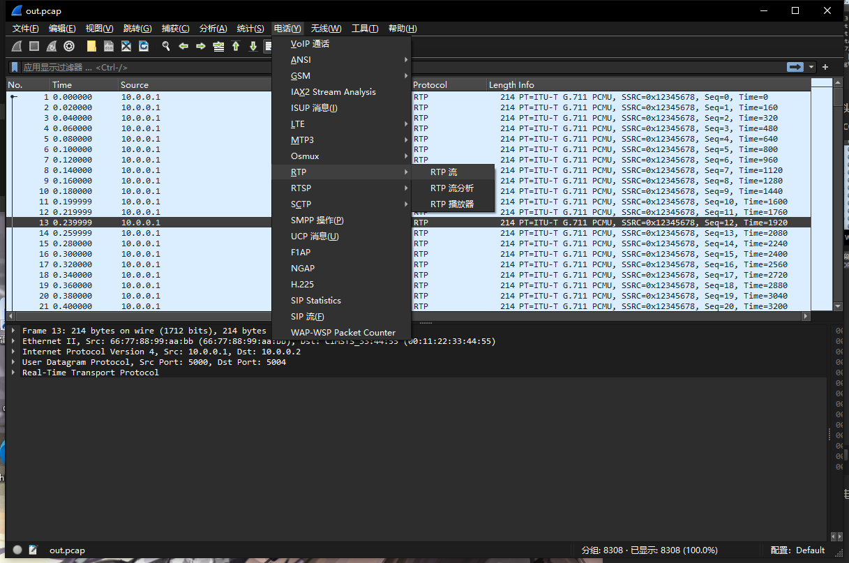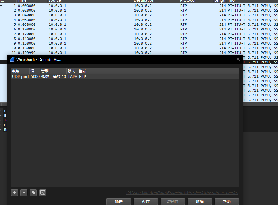 流量头特征和接收的端口可以知道这是个RTP的流量,这个流量一般由于电话协议,这里我们decode as把udp流量选择为RTP