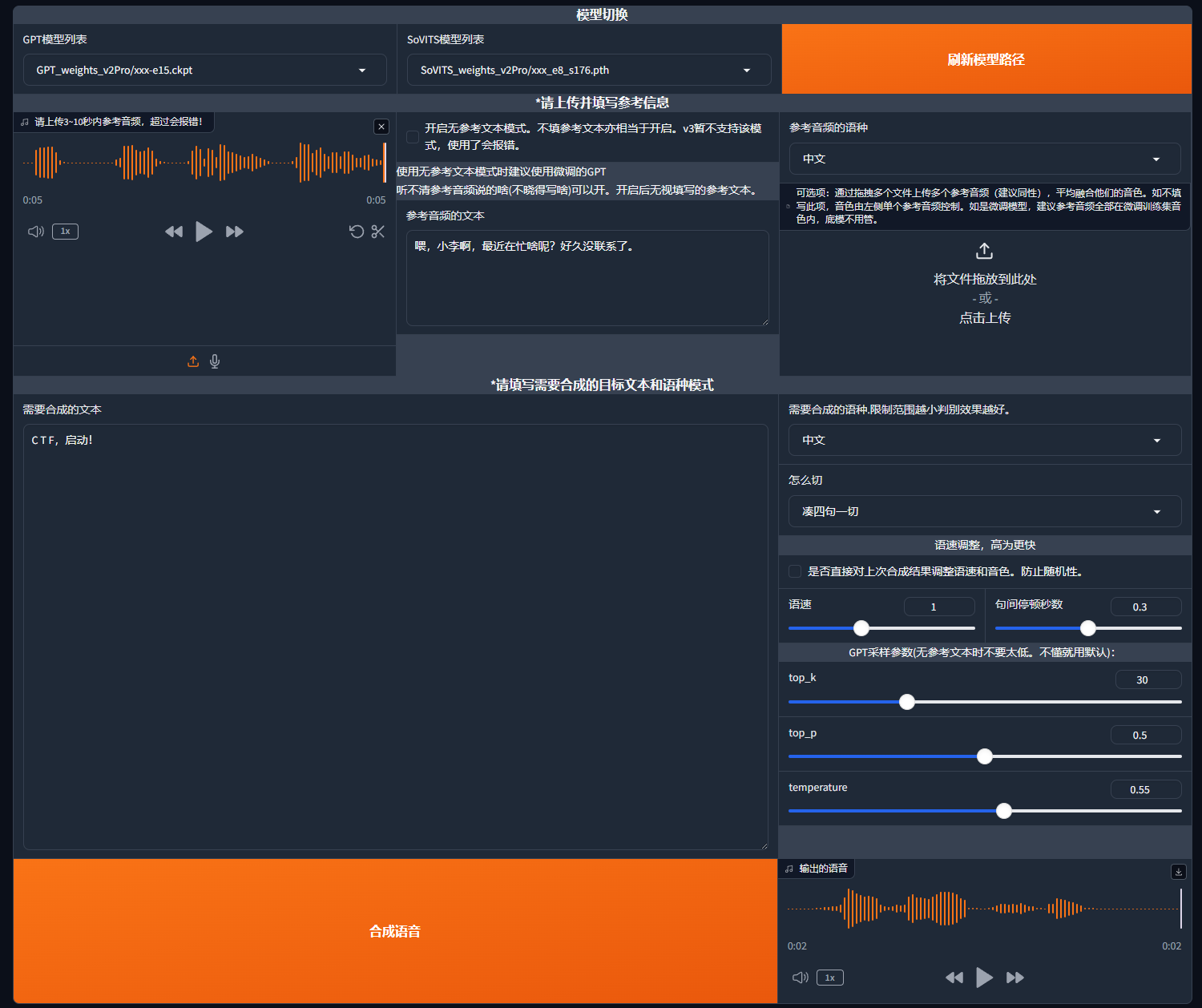 最后输出“C T F,启动!”生成伪造音频即可,然后这里用上前面的接口,直接发送wav过去:
